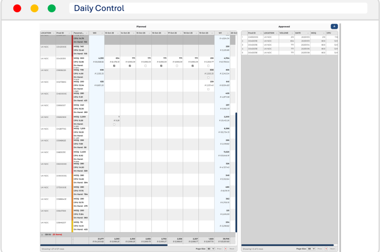 Live visibility and adjustments to optimise your supply chain by monitoring daily inventory vs supply performance & orders against sales open and invoiced orders with alerts