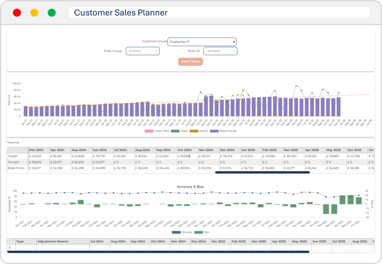 All your plans in one place with each key sales customer able to view sales history, future trends and performance with ability to make recommended adjustments by product and capture assumptions for approval