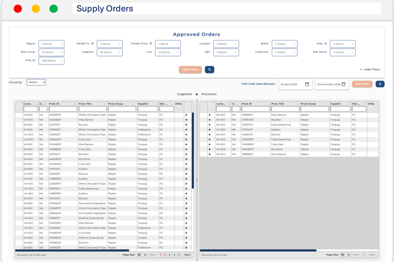 Monthly and weekly suggested orders across the full horizon. With the ability to view production and purchase orders against suggested orders and outstanding alerts updated weekly. Keeping your orders optimised and changes with demand variations.